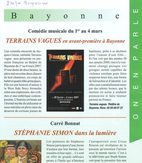 Sa comédie musicale, composée et jouée au théâtre national de BAYONNE. Partenariat : FRANCE3 Bordeaux. SUD OUEST, LE MIDEM de CANNES, la ville de BAYONNE, la préfecture des LANDES.
