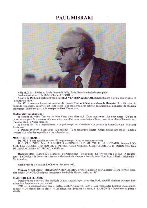 Comédie musicale. Composition du générique. Spectacle joué à L’ALAMBRA de PARIS.