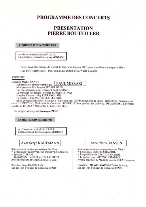 Le FESTIVAL INTERNATIONAL de la musique de film. Création à MANTES, en 1983. Avec la SACEM : la GAUMONT international, TELERAMA, LA SDRM, PATHÉ MARCONI, L’INA, La SNAC, LA SACEM, LE MINISTÈRE DE LA CULTURE... et les compositeurs comme : LAURENT PETIT GIRARD, Claude Bolling, SERGE KAUFMANN, PAUL MISRAKI, PIERRE JANSEN et l’orchestre de l’opéra de PARIS